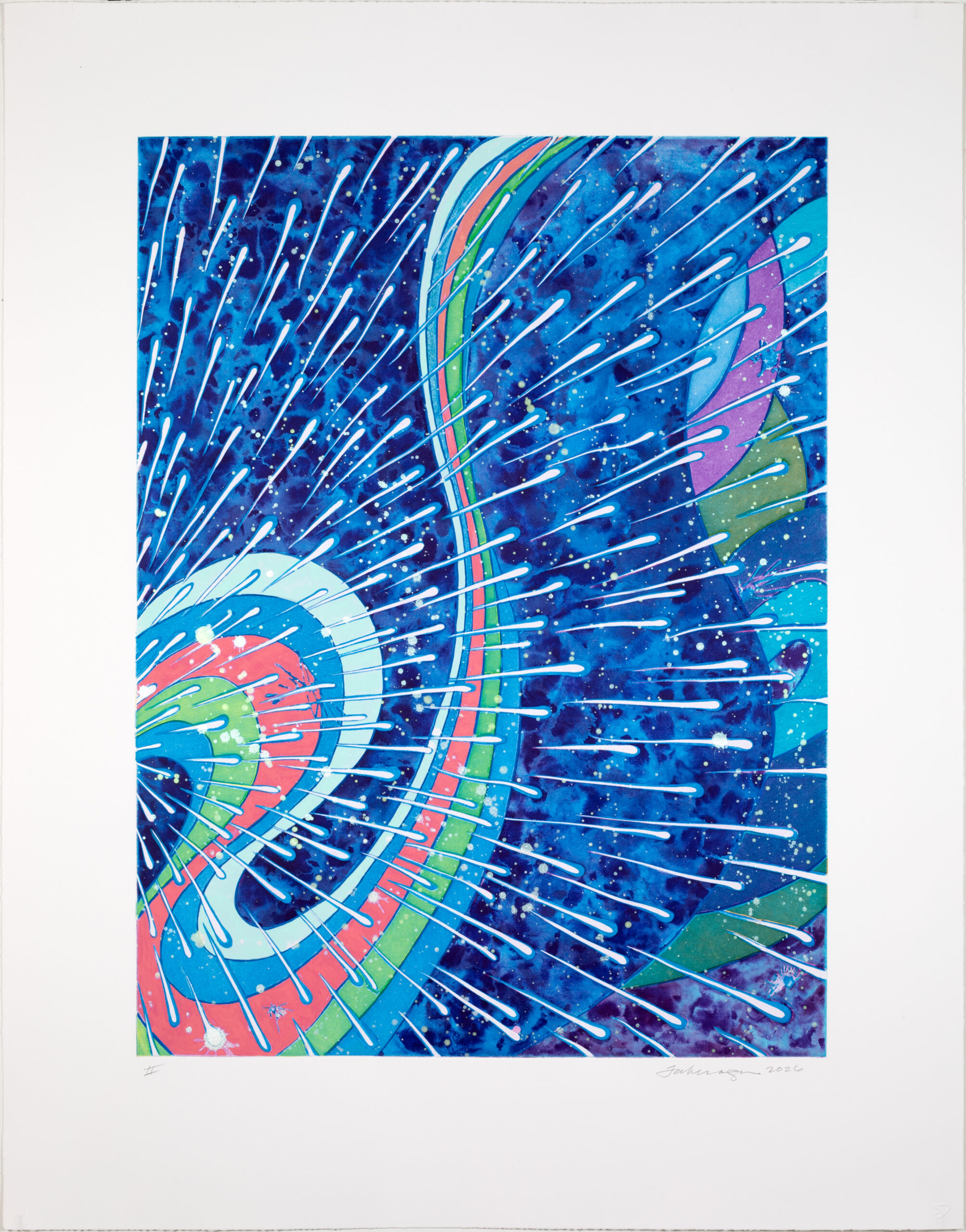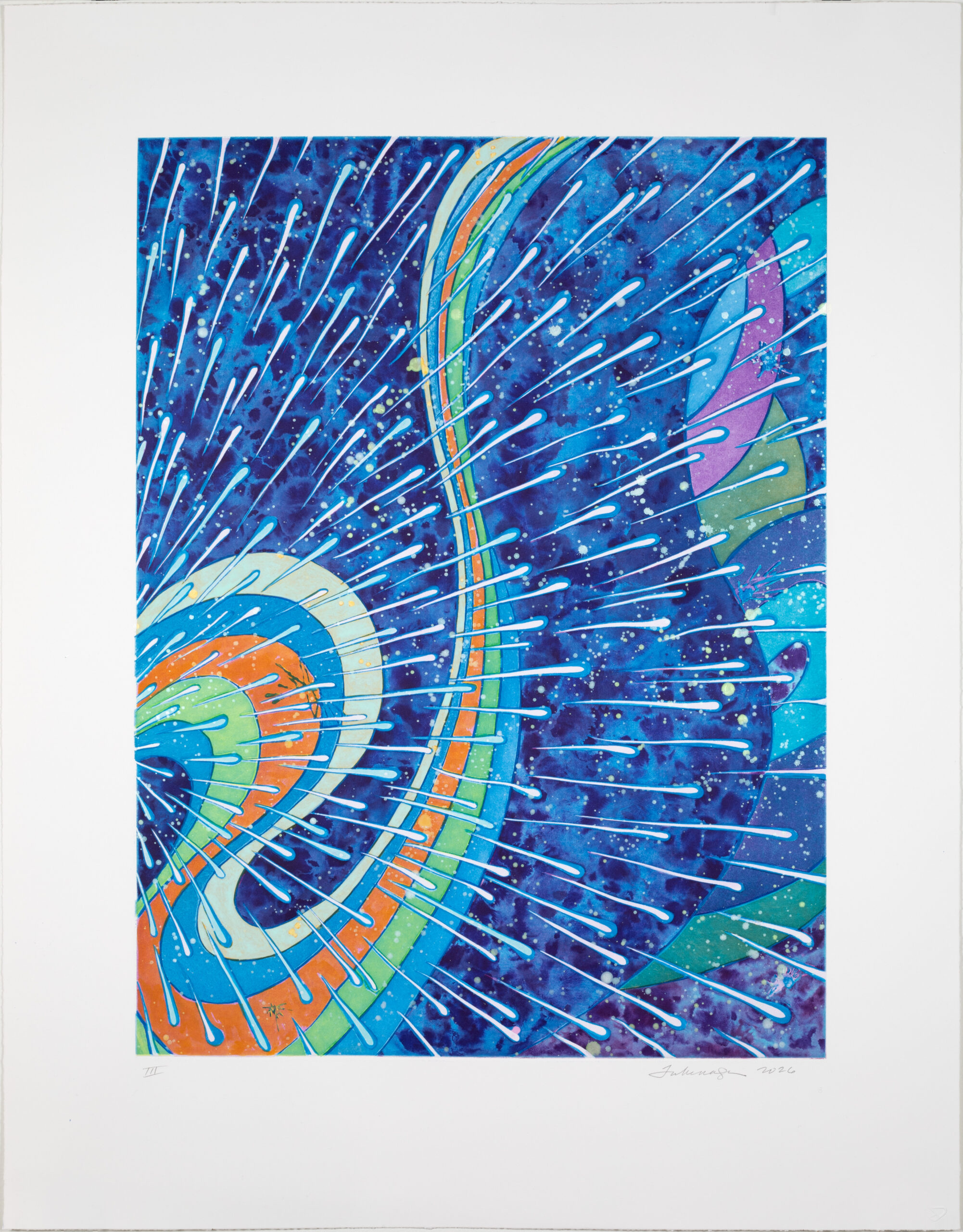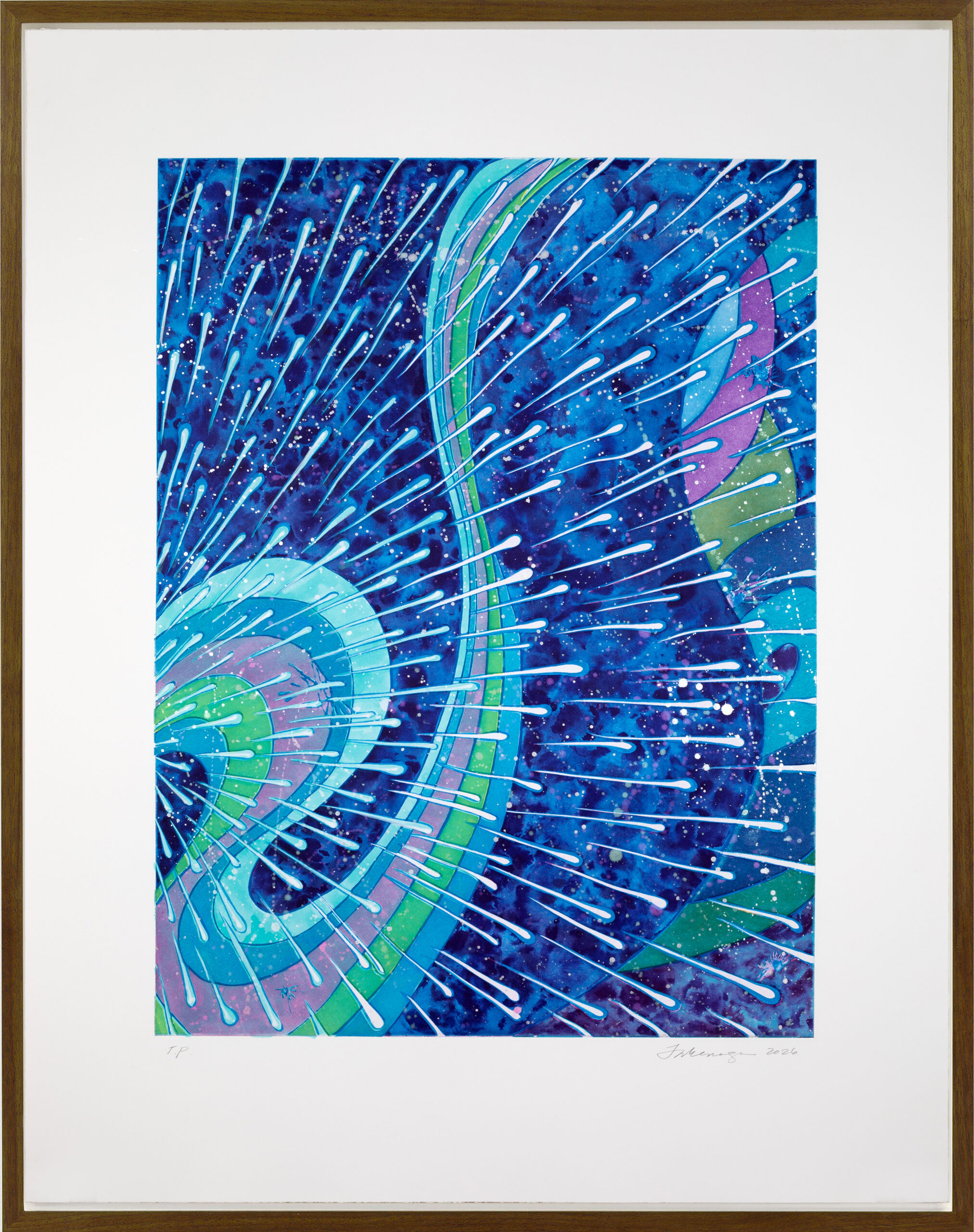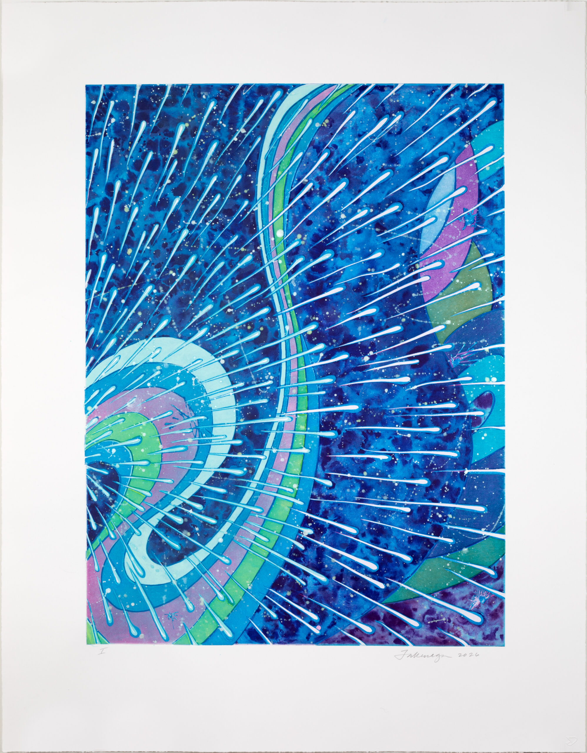 The artist approached this print in a similar manner. She began by flicking soap ground from her brush onto the surface of a copper plate coated in water, creating splashes that bloomed and spread in unexpected ways. A field of atmospheric pattern emerged once the plate was dry. Takenaga then hand painted delicate marks over this pattern. The artist gradually added depth by darkening the shadows with spit bite aquatint, and further defining the drawn elements with additional soap ground. The result is an aurora of blue tones is populated by celestial bodies moving upward through space.