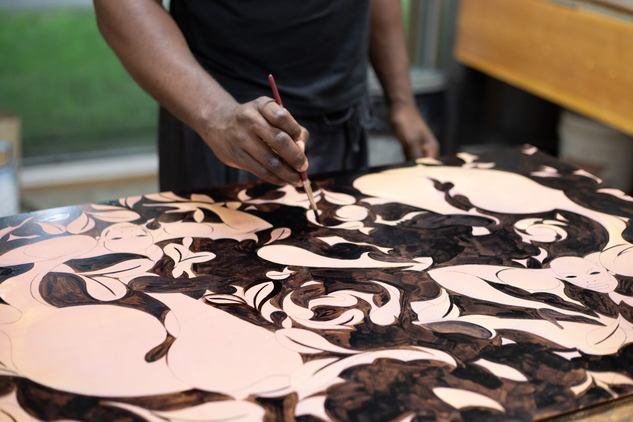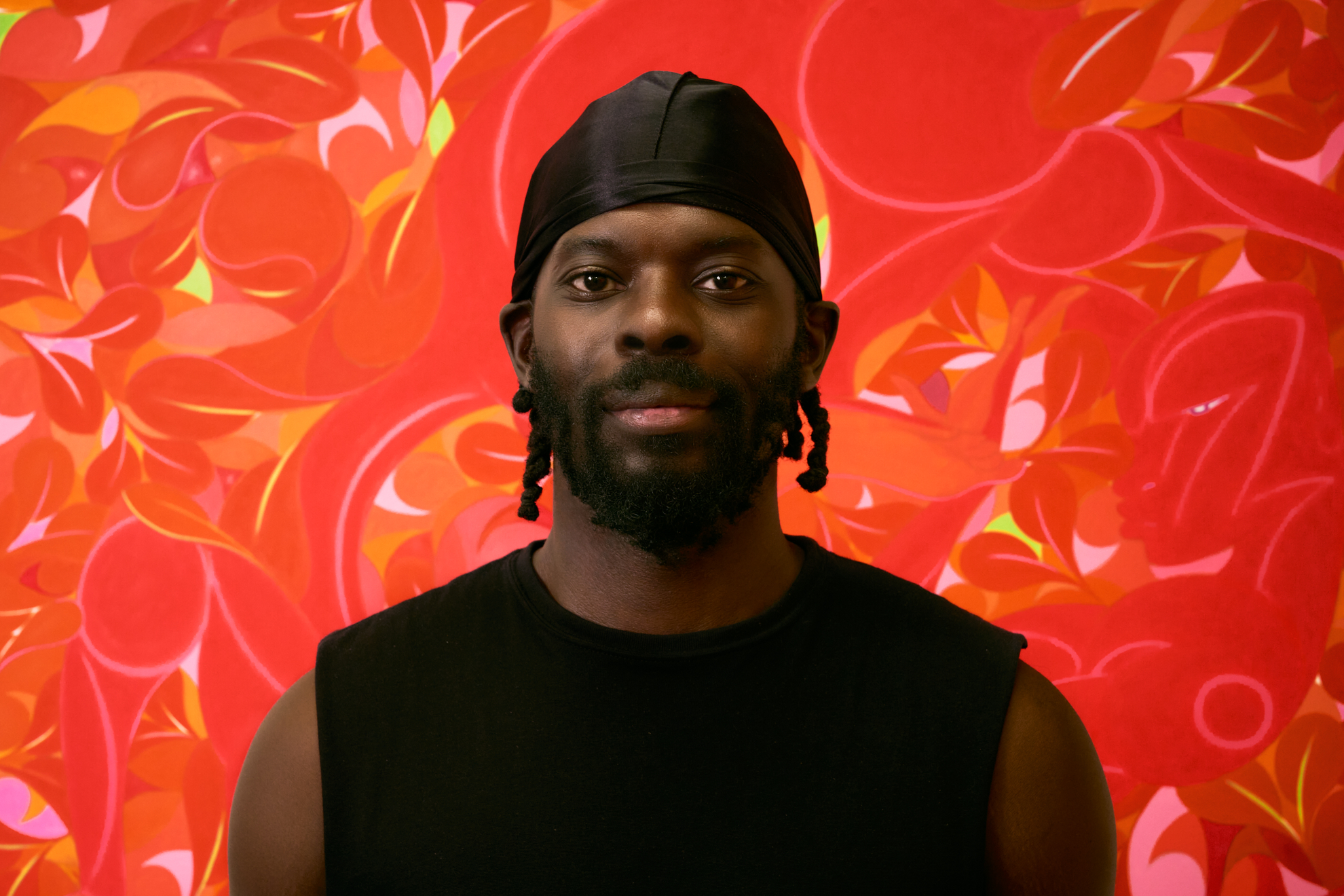 Tunji Adeniyi-Jones (b. 1992, London, England) lives and works in New York, NY. The artist’s paintings emerge from what he describes as “cultural addition, combination, and collaboration.” His practice is inspired by the ancient history of West Africa and its attendant mythology, and by his Yoruba heritage. Recent solo exhibitions include White Cube (Hong Kong), Morán Morán (Los Angeles, CA), Flag Art Foundation (New York City, NY), Nicelle Beauchene Gallery (New York City, NY), White Cube (Paris, FR), and Charleston (Lewes, UK). He will be featured in the 60th Venice Biennale at the Nigerian Pavilion. Adeniyi-Jones’s work can be found in the public collections of the Aishti Foundation (Lebanon), Birmingham Museum of Art (AL), Dallas Museum of Art (TX), Institute of Contemporary Art (Miami, FL), Metropolitan Museum of Art (New York City, NY), Museum Azman (Kuala Lumpur, Malaysia), National Museum of Norway (Oslo), Norval Foundation (Cape Town, South African), Perez Art Museum (Miami, FL), Ståhl Collection (Norrkoping, Sweden), The Studio Museum (Harlem, NY), and many other public and private collections.
