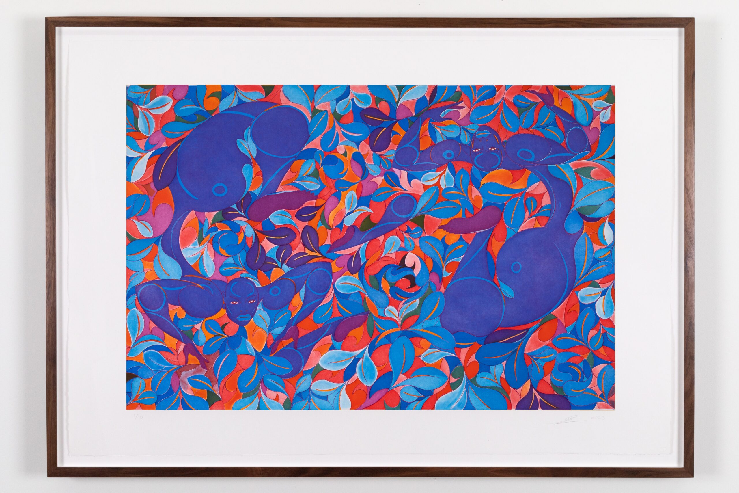 The portfolio and three editions embody and render Adeniyi-Jones’ exploration of subverted narratives and histories, specifically those of Nigeria. The artist’s iconic language of figuration explores West African mythology, ceremony, and ritual. In his new portfolio of monoprints and three editions, the artist plays with simplifying and augmenting the figures as they expressively move through shifting fields of color. Adeniyi-Jones’s masterful use of color relationships, form, and pattern give rise to vibrant and physical compositions in these new etchings.